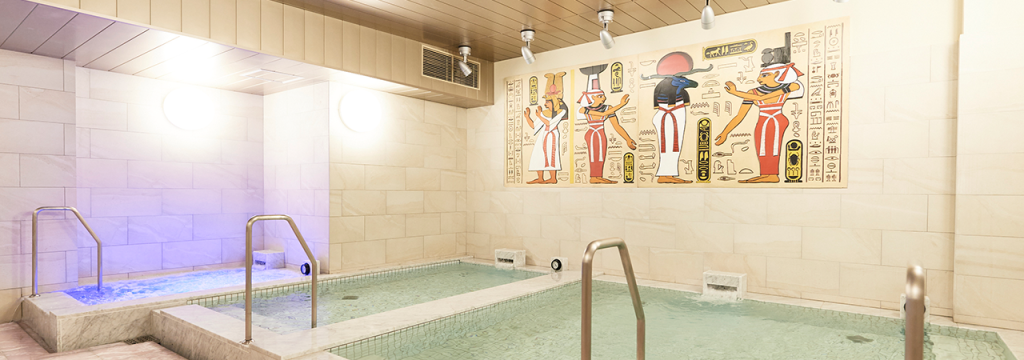 エジプト風のデザインで統一された館内は、訪れた瞬間から非日常へと誘うラグジュアリーなスパ空間です。